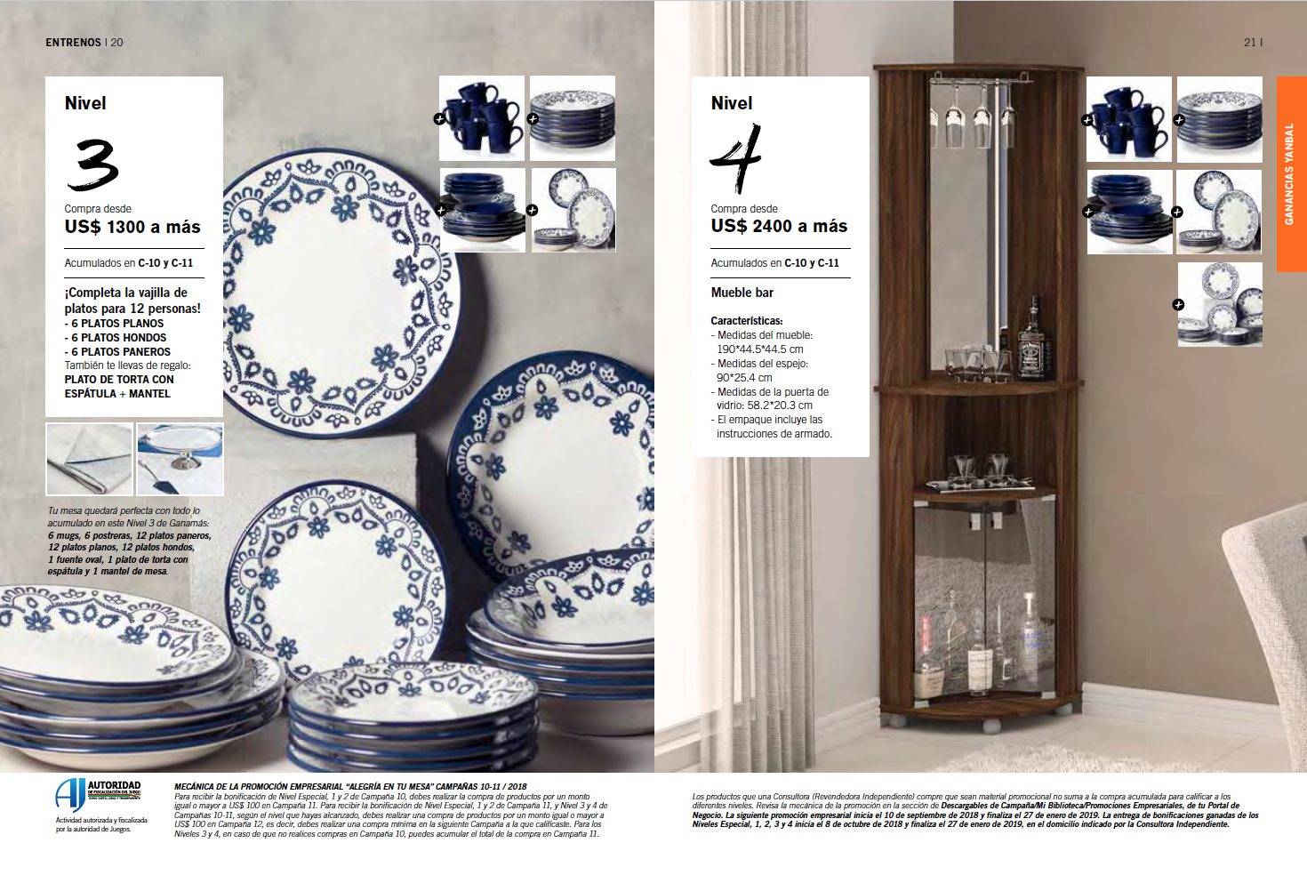 Los productos que una Consultora (Revendedora Independiente) compre que sean material promocional no suma a la compra acumulada para calificar a los diferentes niveles. La siguiente promoción empresarial inicia el 10 de septiembre de 2018 y finaliza el 27 de enero de 2019. La entrega de bonificaciones ganadas de los Niveles Especial, 1, 2, 3 y 4 inicia el 8 de octubre de 2018 y finaliza el 27 de enero de 2019, en el domicilio indicado por la Consultora Independiente.